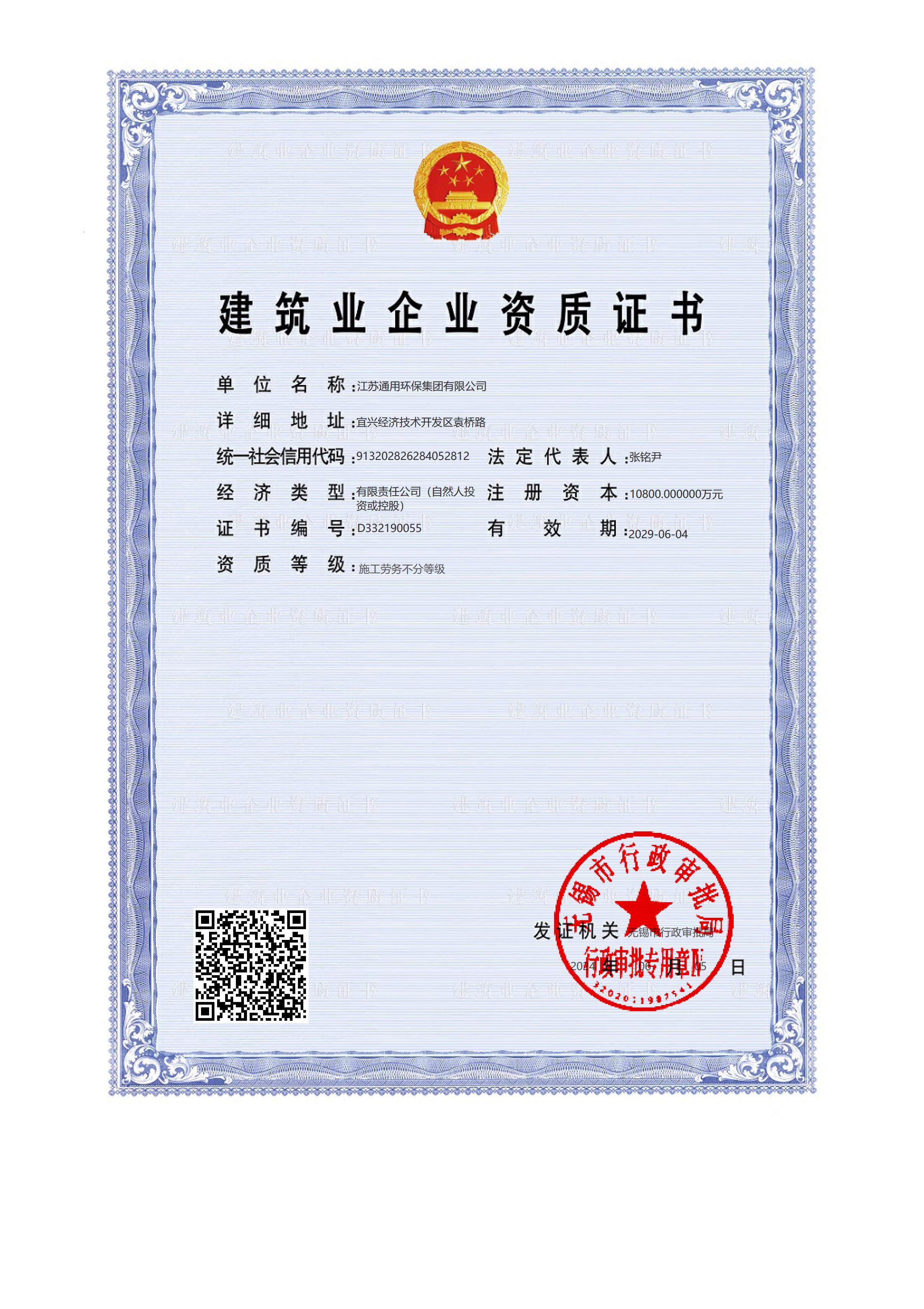 市政总承包贰级、电子与智能化承包贰级、机电安装承包贰级、环保工程专业承包壹级