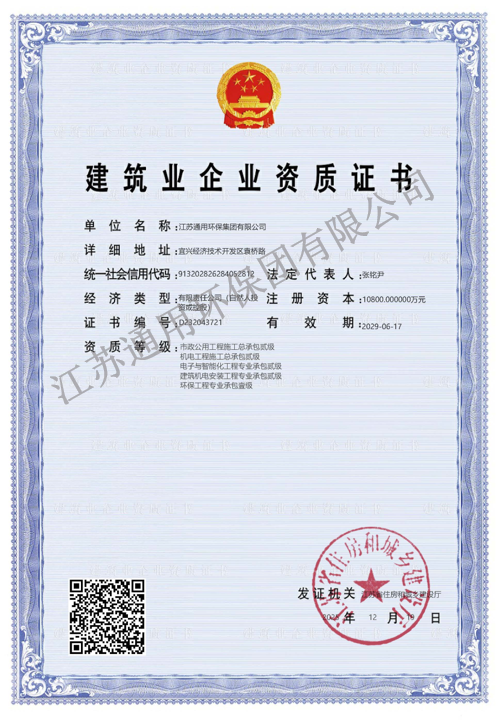 喜讯传佳音,奋进正当时。经江苏省住房和城乡建设厅严格审核与批准,江苏通用环保集团有限公司成功取得“机电工程施工总承包贰级”资质。